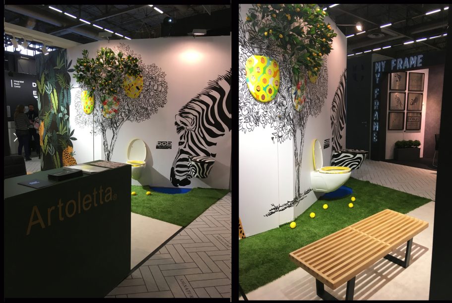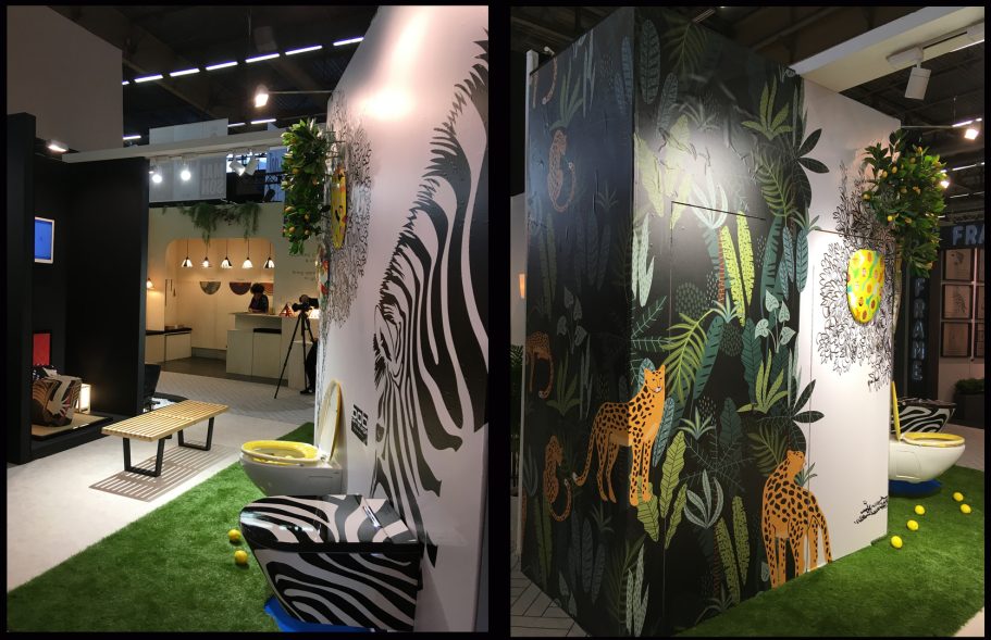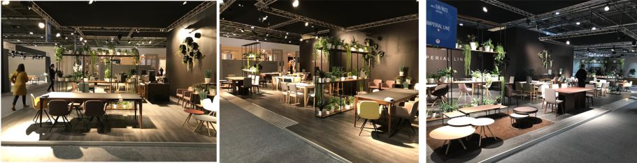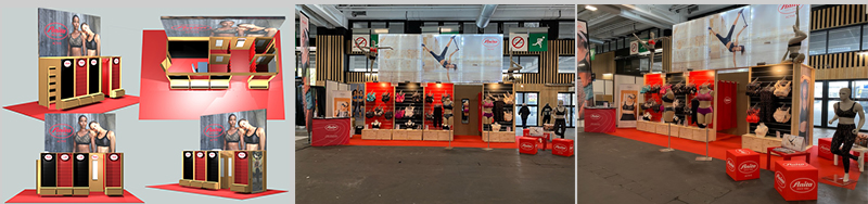 Ce stand se distingue par ses structures modulaires en cadres métalliques blancs et ses parois en tissu translucide qui délimitent les espaces tout en offrant une ouverture visuelle. Le sol alterne entre un revêtement en bois clair et bois foncé, ajoutant du dynamisme et une touche chaleureuse à l’ensemble. Ce contraste met en valeur les éléments végétaux et le mobilier coloré, créant une ambiance contemporaine et élégante.