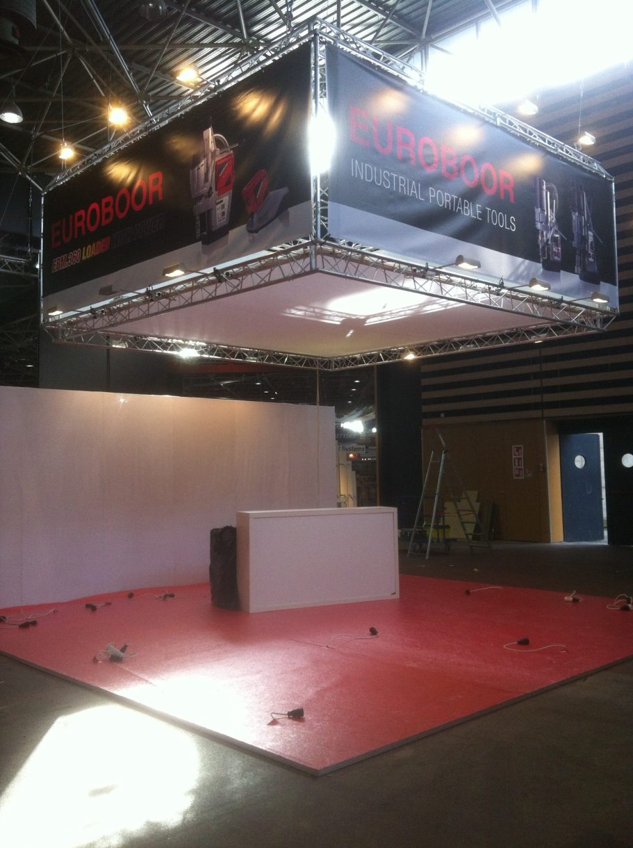 Ce stand spacieux et lumineux met en valeur le mobilier grâce à des murs blancs minimaliste et une disposition ouverte. Une structure en treillis métallique suspendue au-dessus apporte une touche moderne, tout en intégrant l'éclairage, créant en espace à la fois fonctionner et sophistiqué.