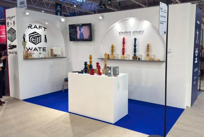 Ce stand au design moderne et raffiné repose sur des murs noirs qui met en valeur les luminaires suspendues et les éléments décoratifs. la structure intègre un angle arrondi qui adoucit les lignes droites. Une réception et des sphère lumineuse suspendues à différentes hauteurs créent une ambiance chaleureuse et immersive. Un panneau explicatif illustre également l'héritage artisanal.