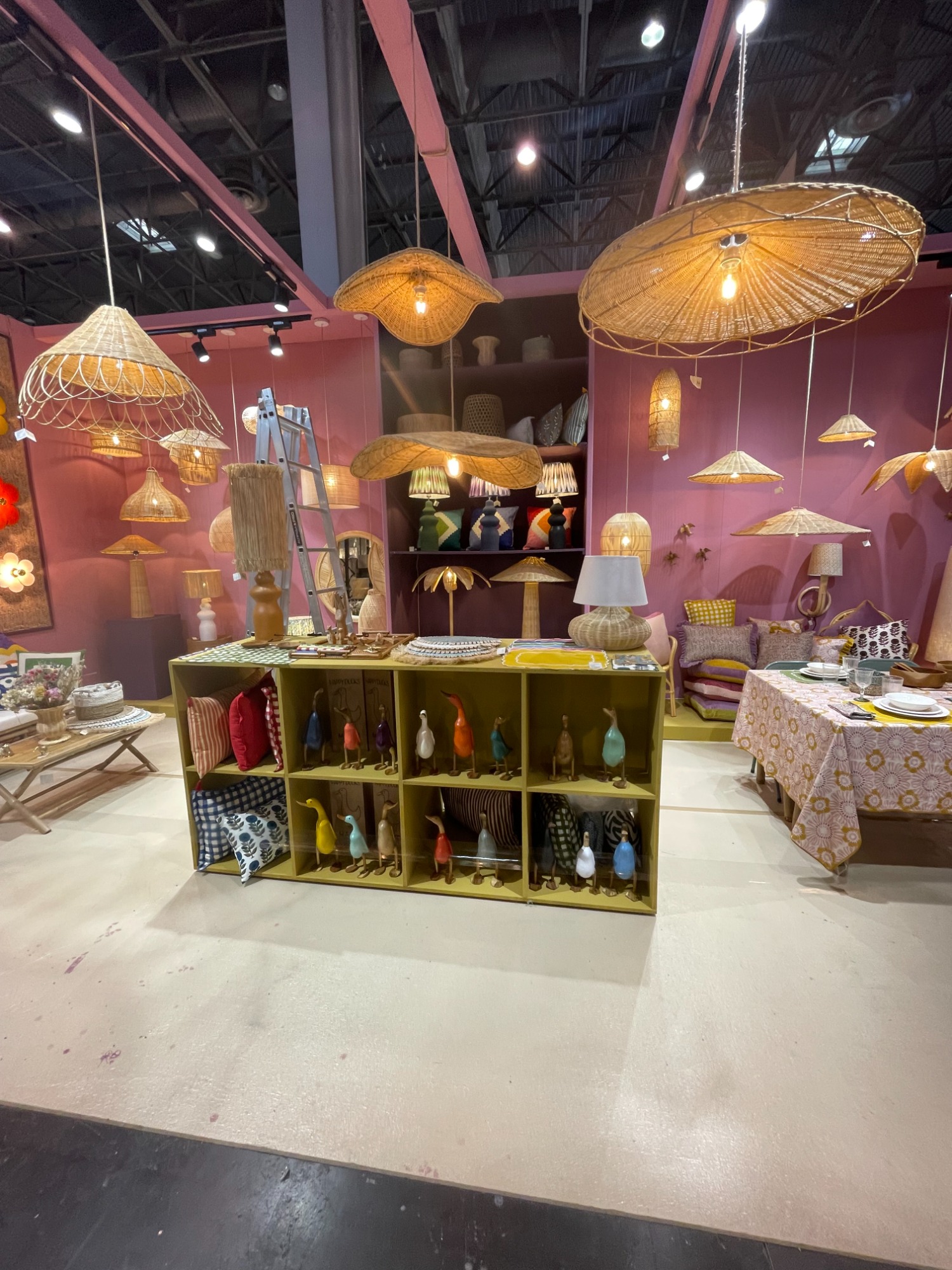 Ce stand au design moderne et raffiné repose sur des murs noirs qui met en valeur les luminaires suspendues et les éléments décoratifs. la structure intègre un angle arrondi qui adoucit les lignes droites. Une réception et des sphère lumineuse suspendues à différentes hauteurs créent une ambiance chaleureuse et immersive. Un panneau explicatif illustre également l'héritage artisanal.