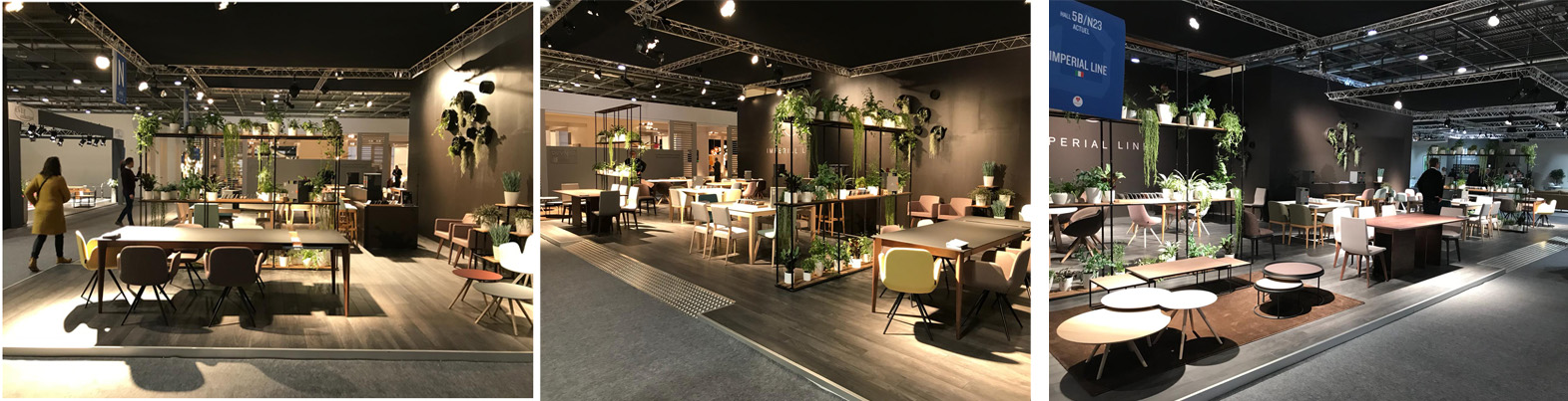 Ce stand spacieux et lumineux met en valeur le mobilier grâce à des murs blancs minimaliste et une disposition ouverte. Une structure en treillis métallique suspendue au-dessus apporte une touche moderne, tout en intégrant l'éclairage, créant en espace à la fois fonctionner et sophistiqué.