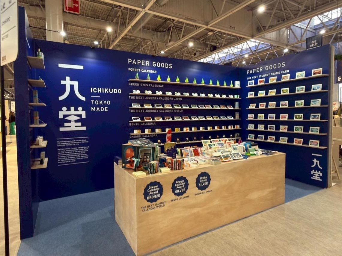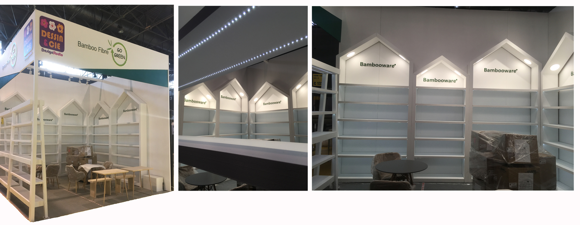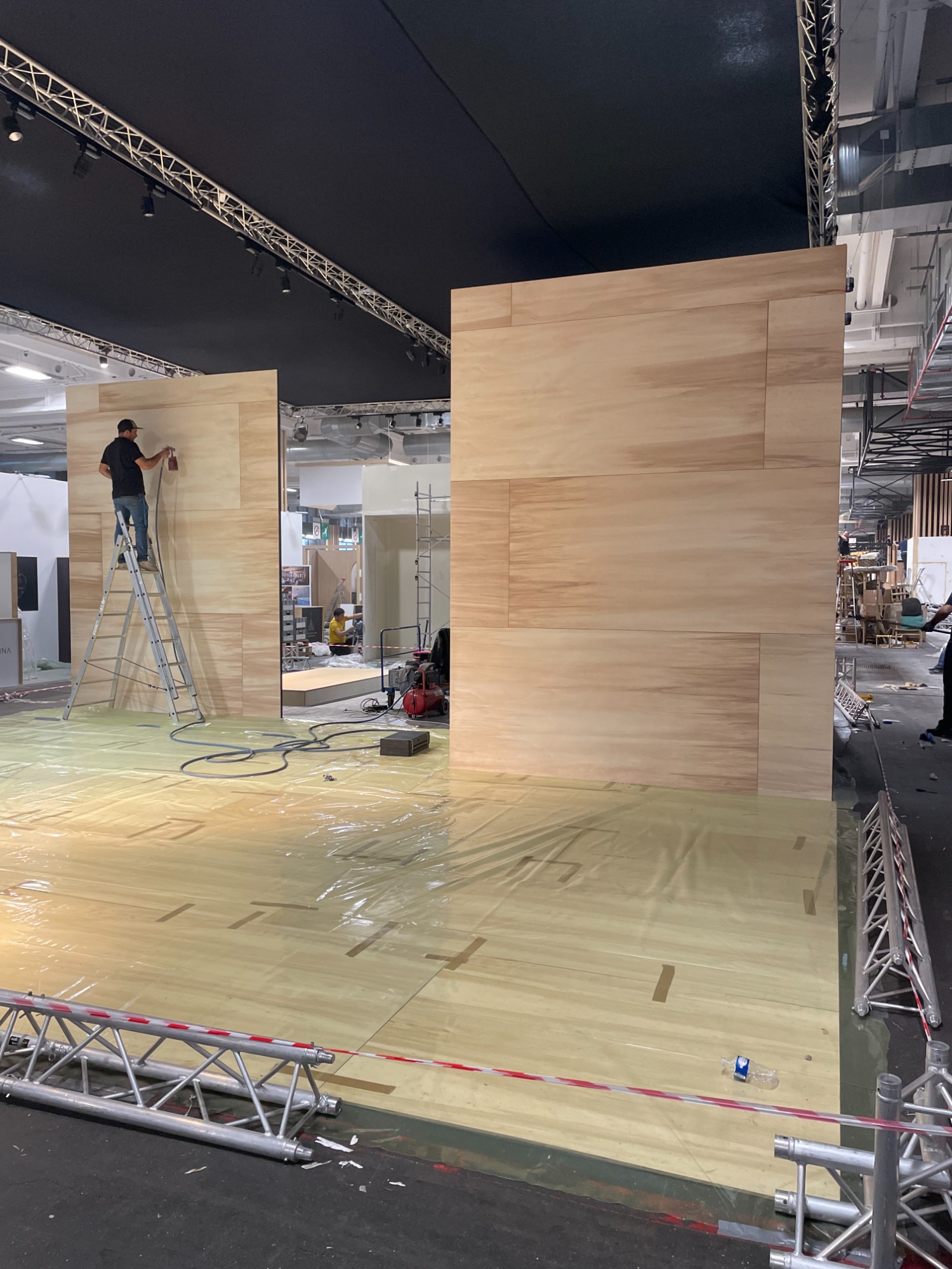 Ce stand est conçu pour offrir une organisation claire et fonctionnelle. Avec des étagères en bois intégrés dans un fond bleu profond, il permet une exposition linéaire et esthétique des produits en papier. Les panneaux rétro éclairé et les tables en bois brut offrent une harmonie visuelle entre modernité et simplicité, tout en mettant en avant la qualité des articles exposé l'espace est passé pour faciliter l'interaction avec les visiteurs, tout en valorisant le design des produits.