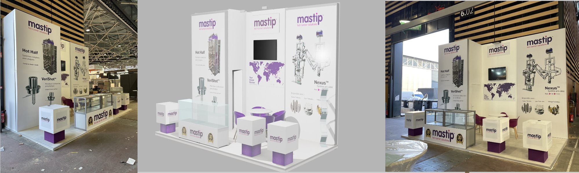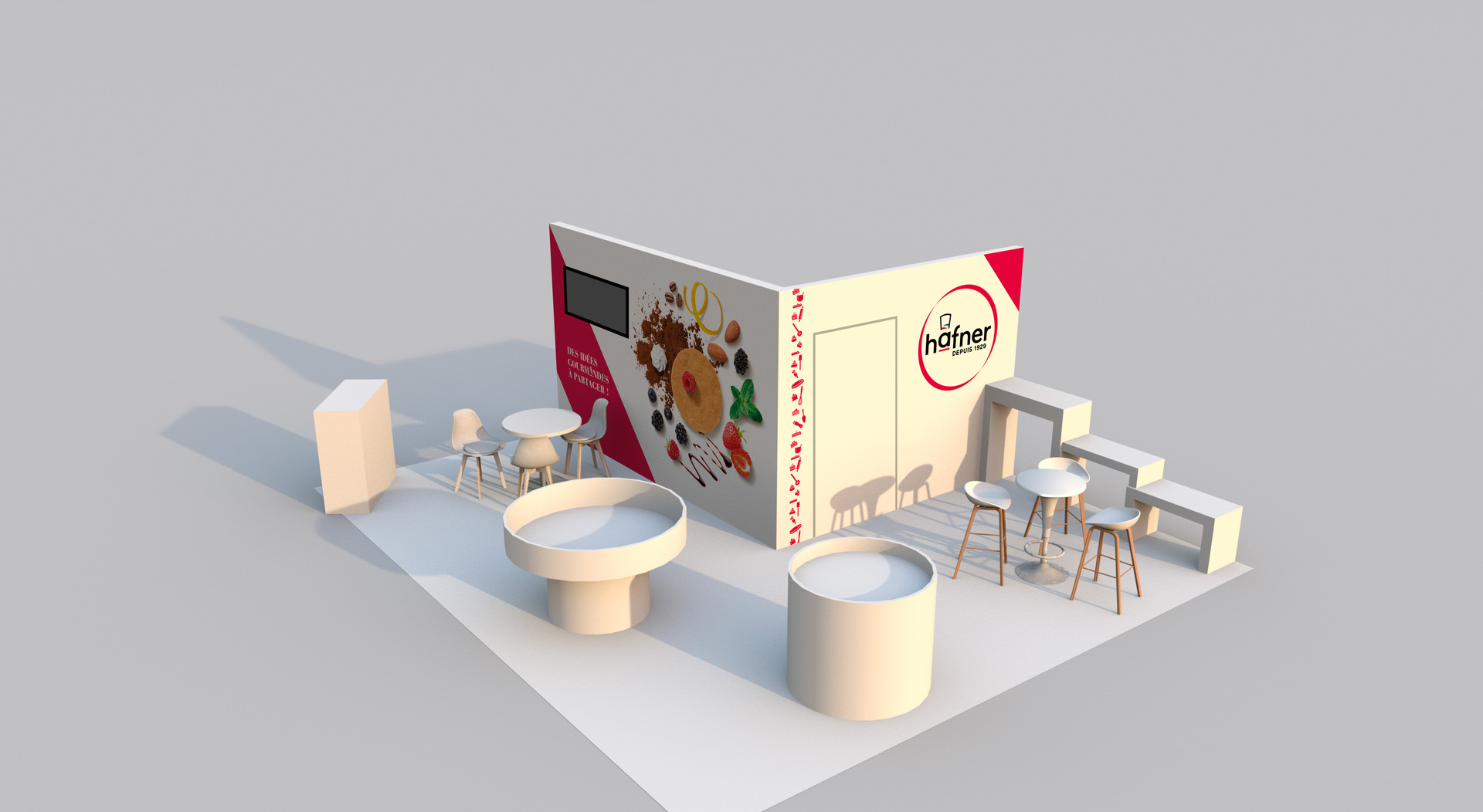 Ce stand se distingue par ses structures modulaires en cadres métalliques blancs et ses parois en tissu translucide qui délimitent les espaces tout en offrant une ouverture visuelle. Le sol alterne entre un revêtement en bois clair et bois foncé, ajoutant du dynamisme et une touche chaleureuse à l’ensemble. Ce contraste met en valeur les éléments végétaux et le mobilier coloré, créant une ambiance contemporaine et élégante.